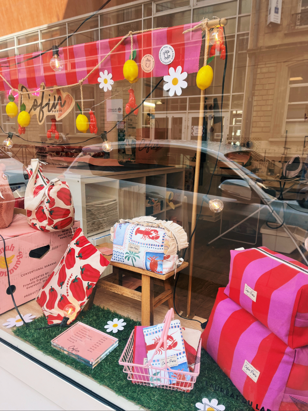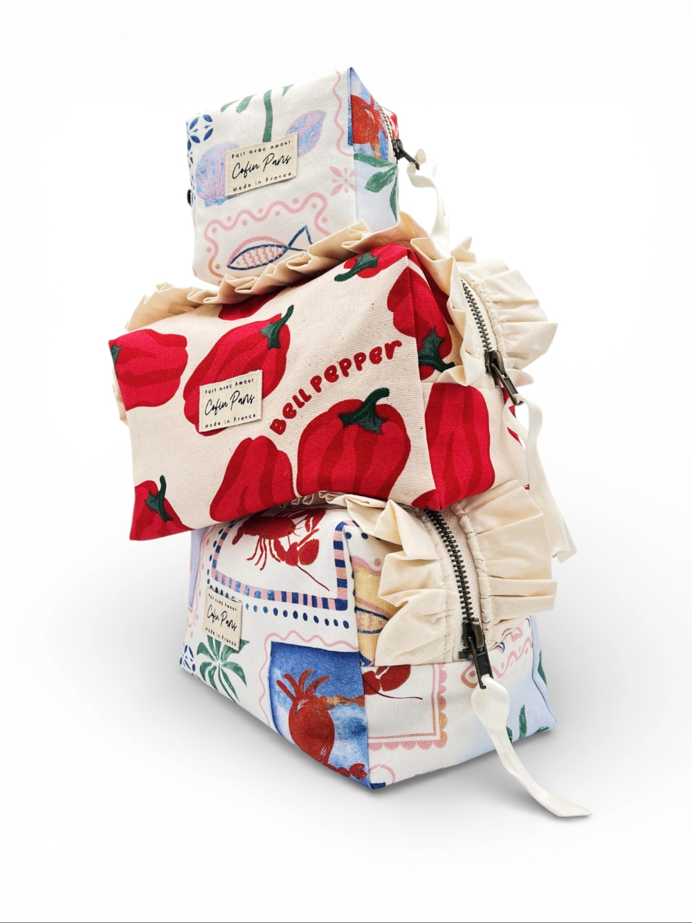 Sur l’extérieur, une étiquette en coton tissée au fil noir « Fait avec amour / Cofin Paris / Made in France ».